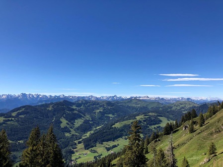 Der Aufstieg führt uns zur Alpe Hochried (900 m). Über die Mittelstation und die Schwand-Alpe erreichen wir den Mittag-Gipfel (1452 m). Ein herrliches Panorama mit Blick in die Allgäuer Bergwelt präsentiert sich uns. Auf einer großen Panoramalandkarte versuchen wir die Berge von oben zu sehen und zu benennen. Nach der verdienten Rast steigen wir gen Osten zur Bildkapelle hinab. Wir passieren flüchtig Ettensberg und erreichen Schwanden. Richtung Rieder-Alp gelangen wir zurück zur Talstation der Mittagbahn.