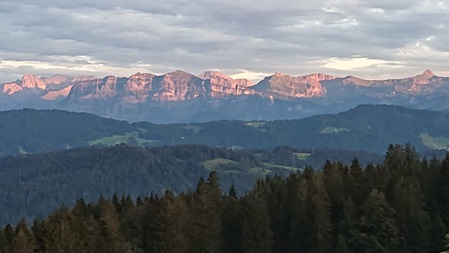 Weiter führt der Weg entlang an Wiesen und Wäldern, duftender Heugeruch lädt zum Verweilen ein und über einen schönen Waldweg gelangen wir auf ein Stück Fahrstraße, die uns gradewegs auf den Pfänder führt.